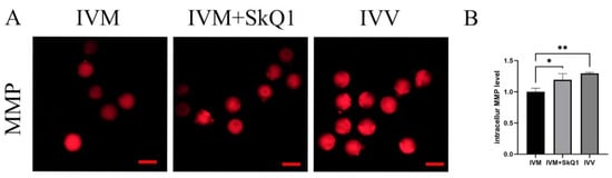 Effects of SkQ1 on mitochondrial membrane potential in in vitro-matured mouse oocytes. (A) Representative images of intracellular MMP (stained with TMRE as red fluorescence) of three groups of oocytes. (B) Quantification data of fluorescence images representing MMP levels. * represents p < 0.05; ** represents p < 0.01. Scale bar: 50 μm. IVM—in vitro-matured oocytes; IVM + SkQ1—SkQ1-treated in vitro-matured oocytes; IVV—in vivo-matured oocytes.