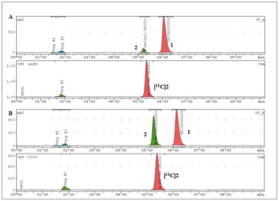 Analytical HPLC chromatograms: (A) radiolabelling reaction crude analysis: 1 Rt = 6.03 min; 2 Rt = 5.13 min; [11C]2 Rt = 5.21 min. (B) Co-injection of the same mixture reaction used in (A) and standard reference compound 2.