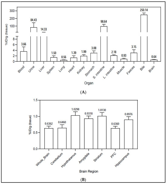 The ex vivo biodistribution studies were performed one hour after the intravenous injection of the [11C]2 injectable solution. For these studies, transcardiac perfusion with saline was performed, eliminating blood traces from the organs. These studies showed an uptake in bile (250.1 ± 23.97%ID/g), showing that the radiotracer is mainly eliminated through the hepatobiliary system (Figure 5A). Urinary excretion also occurred, though less radioactivity was found in the urine (84.43 ± 59.41%ID/g). The small intestine (98.64 ± 25.57%ID/g) and liver (14.33 ± 6.39%ID/g) were the organs with major uptake of the radiotracer. The high uptake in the small intestine is explained by the high density of Y2 receptors that exist in this organ [27,28,29], while the uptake in the liver is related to the metabolization of the tracer. Moderately low uptake was found in the stomach (3.082 ± 0.7135%ID/g), large intestine (2.18 ± 0.21%ID/g) and kidneys (1.99 ± 0.49%ID/g). Our studies also showed moderate levels of the radiotracer in the blood (3.66 ± 1.55%ID/g), suggesting a slow metabolization of the radiotracer in the bloodstream, which was also mentioned by Winterdahl et al. [11].
