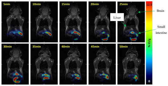 The PET images were acquired and fused with the MRI image to better elucidate the areas in which the radiotracer was bound to the Y2 receptor. Figure 6 presents the whole-body distribution PET image of N-[11C]Me-JNJ-31020028 over time. Even though the radiotracer has whole-body distribution, it is only possible to see the radiotracer’s accumulation in the gut, reaching its peak in between 25 and 30 min. This may not mean that the radiotracer only accumulates in the small intestine. However, it accumulates in a higher density than in other organs and the brain, confirmed by the ex vivo biodistribution depicted in Figure 5. This higher accumulation of the tracer in the small intestine is observed in both PET images and ex vivo results, in which, in the latter, the sample analysed was only the intestine wall. Therefore, these results represent the uptake of the tracer by the high density of Y2 receptors in the small intestine and are not due to excretion.