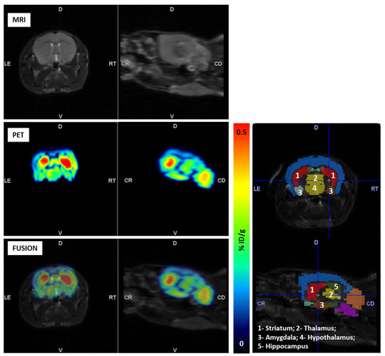 Concerning the radiotracer’s accumulation in the brain, it was possible to identify several brain regions with high radiotracer accumulation, such as the striatum, thalamus, amygdala, hypothalamus and hippocampus (Figure 7).