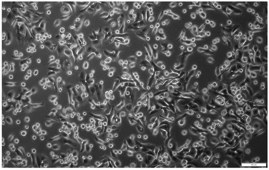 Amniotic cells isolated from human placentas and used in the experimental model constituted a relatively homogeneous population of hAECs [,] characterised by the presence of epithelial cell-specific cytokeratins and the absence of markers typical of mesenchymal cells. They had some characteristics of pluripotent cells, such as the presence of the surface marker proteins SSEA-3 and SSEA-4 []. On average, 98% of them had the B7-H3 protein on their surface, which has a significant effect on the immune response by stimulating Th1 and Th2 lymphocytes and reducing the secretion of IL-2 and IFN-γ and the proliferation of T cells [].