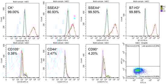 Cytometric characterization of isolated hAECs. After 48 h of culturing, large numbers of SSEA-4+ and SSEA-3+; CK14, 15, 16, and 19+; and B7H3+ were detected; and only a few CD105+, CD44+, and CD90+ were detected. The percentage given is the average of the six populations tested. Only a few cells showed characteristics of necrotic cells: PC—cells labelled with the corresponding antibody, IC—isotype control, and UC—cells not labelled with antibodies.