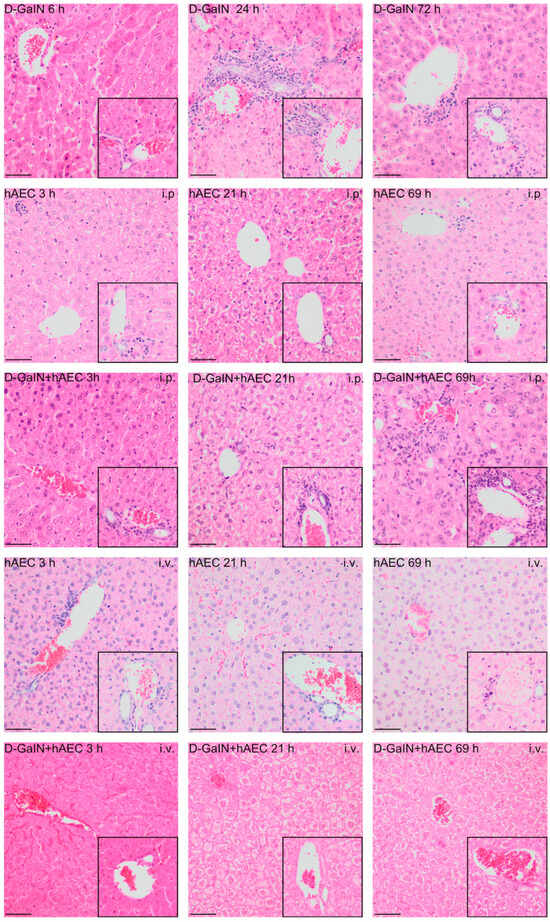 Histopathological changes in mouse livers after administration of D-GaIN and/or hAECs intraperitoneally or intravenously. The larger image shows the pericentral zone 3 and zone 2 of the hepatic acini. The inset in the lower right corner shows the area around periportal zone 1. 6/24/72 h after D-GaIN administration; 3/21/69 h after hAEC administration; i.v.—intravenous administration, i.p.—intraperitoneal administration. Control mice were injected with NaCl and showed no histopathological changes in the liver. H&E staining; Magn. ×200, scale bar = 40 µm.