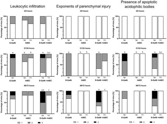 Histopathological assessment of liver damage in mice scored 1, 2, or 3 according to a three-grade histopathological classification. First number (3, 21, 69) at a given time point—time since hAEC administration; second number (6, 24, 72) at a given time point—time since D-GaIN or NaCl administration. i.p.—intraperitoneal administration; i.v.—intravenous administration; p < 0.05 as compared to a—the control, b—D-GaIN, c—intraperitoneal injection of hAECs. Control mice were injected with NaCl and showed no histopathological changes in the liver.