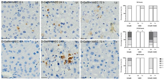Immunodetection of apoptotic cells based on the presence of caspase-3 protein (left images). Percentage of mice assigned a score of 1–5 on a histopathological scale (1–5) assessing the number of apoptotic Casp+ cells in the liver (right graphs). First number (3, 21, 69) at a given time point—time since hAEC administration; second number (6, 24, 72) at a given time point—time since D-GaIN administration. p < 0.05 as compared to—a—the control, b—D-GaIN; i.p.—intraperitoneal administration; i.v.—intravenous administration. Magn. ×200. Scale bar = 40 µm.