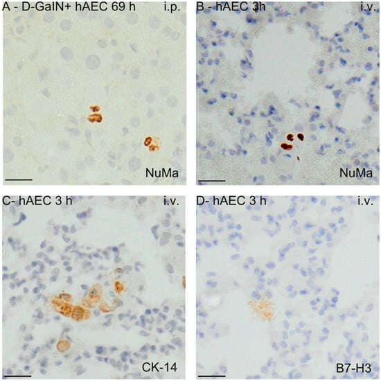 Visualisation of hAECs delivered intraperitoneally or intravenously into the mouse liver (A) and lungs (B–D) at the time points corresponding to the largest number of identified hAEC cells. The examples shown in the images concern immunodetection of NuMa (A,B), CK14 (C), and B7H3 (D) markers in the liver and lungs. 3/69 h—hours after hAEC administration; i.v.—intravenous administration; i.p.—intraperitoneal administration. Magn. ×200. Scale = 40 µm.