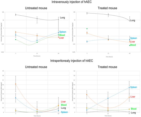 In contrast, after intravenous administration of hAECs, the largest amounts of human DNA were detected in the lungs of both intoxicated and non-intoxicated mice, but this amount decreased statistically significantly over time. Little or no human DNA was detected in the liver, spleen, and blood of these mice.