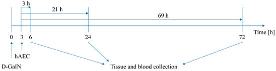 Subsequently, at 6, 24, and 72 h after D-GaIN administration and at 3, 21, and 69 h after hAEC administration, lungs, spleen, liver, and blood were collected from recipient mice (Figure 9). hAECs were visualised in the collected tissues and blood by immunohistochemistry and identified by the detection of human DNA. In addition, biochemical and morphological testing of mouse blood was performed to assess recipient health and liver damage, and histological staining with haematoxylin and eosin was used to assess histopathological changes induced in the liver.