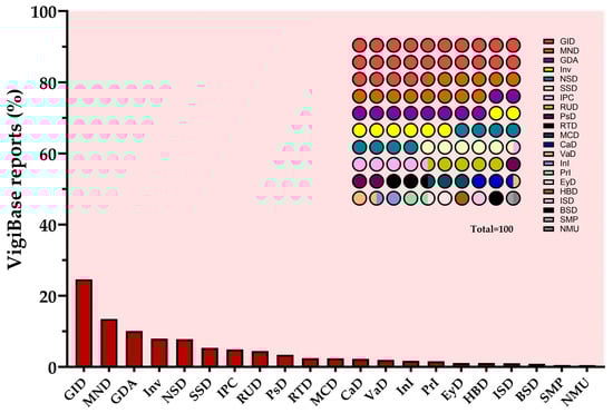 VigiBase reports of ADRs potentially caused by metformin in real-word therapy. GID = gastrointestinal disorders; MND = metabolism and nutrition disorders; GDA = general disorders and administration side conditions; Inv = investigations; NSD = nervous system disorder; SSD = skin and subcutaneous tissue disorders; IPC = injury, poisoning, and procedural complications; RUD = renal and urinary disorders; PsD = psychiatric disorders; RTD = respiratory, thoracic, and mediastinal disorders; MCD = musculoskeletal and connective tissue disorders; CaD = cardiac disorders; VaD = vascular disorders; InI = infections and infestations; PrI = product issues; EyD = eye disorders; HBD = hepatobiliary disorders; ISD = immune system disorders; BSD = blood and lymphatic system disorders; SMP = surgical and medical procedures; NMU = neoplasms benign, malignant, and unspecified. Created with GraphPad Prism 10.1.2 software.