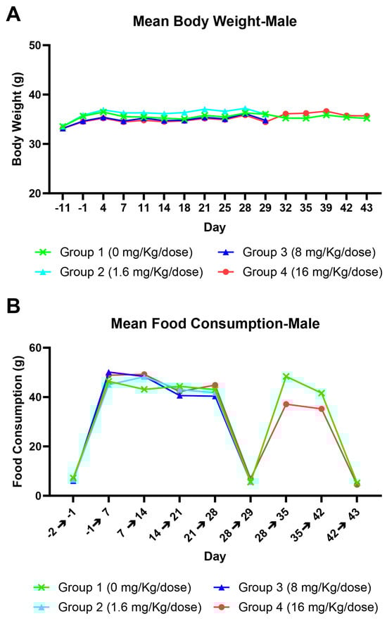 Relationship between PolySia-NPs vs. mean body weight (A) and mean food consumption (B) in mice.