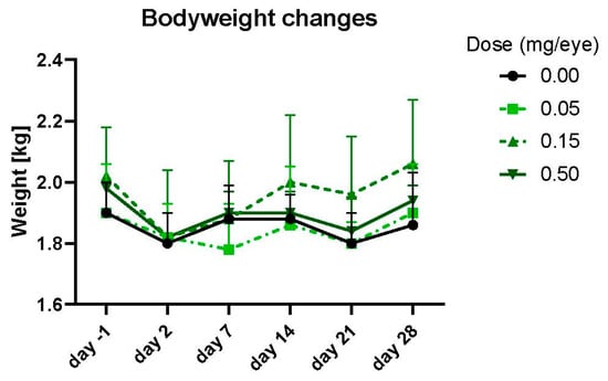 A single administration of PolySia-NPs by intravitreal injection at doses of 0.050, 0.150, and 0.500 mg/eye to Dutch Belted rabbits was well tolerated on Days 29 or 43. There were no mortalities and no PolySia-NP-related clinical observations or effects on body weights, body weight changes (Figure 3), food consumption, hematology, coagulation, or clinical chemistry parameters.