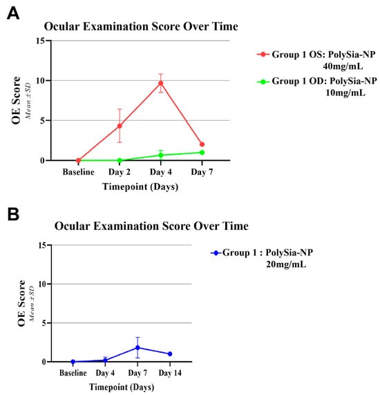 Ocular examination scores in OS and OD from rabbits treated with IVT injections of PolySia-NPs (A). OE score in rabbits treated with IVT injections of PolySia-NPs (B).