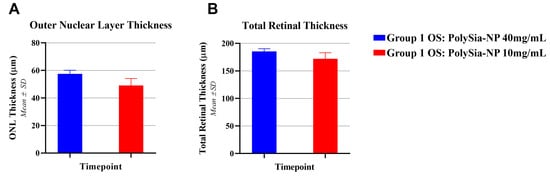 Optical coherence tomography (OCT) was performed on Day 7 to measure ONL and total retinal thickness. The outer nuclear layer (ONL) thickness was measured, and the OSs (PolySia-NP 40 mg/mL) had a slightly larger average thickness than the ODs (PolySia-NP 10 mg/mL), at 57.6 ± 2.6 μm compared to 49.1 ± 5.1 μm (Figure 5A). Total retinal thickness was slightly larger in the OSs than in the ODs on Day 7 (185.3 ± 4.9 μm vs. 171.9 ± 11.0 μm (Figure 5B), within the total thickness baseline range of 179–187 μm recorded previously (Krishnan et al., 2023) []. Based on the results, 20 mg/mL was chosen as a tolerable dose of PolySia-NPs.