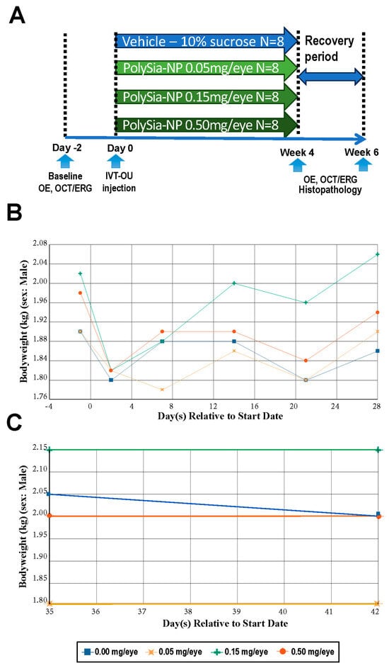 Experimental design (A) and bodyweight changes in male non-human primates after IVT administrations of PolySia-NPs recorded for 28 days (B) and from day 35 to day 42 (C).