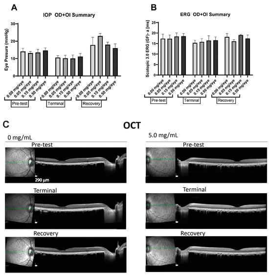 Effect of IVT administrations of PolySia-NPs on intraocular pressure (IOP) (A), electroretinography (ERG) (B), and optical coherence tomography (OCT) (C). Readings were performed at baseline (pre-test), on Day 14 (terminal), and on Day 28 (recovery). Green line represents the transversal axis of the eye for the OCT imaging.