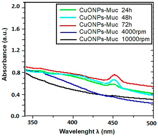 4.5. Characterization of CuONPs-Muc Using Ultraviolet–Visible Spectroscopy Analysis