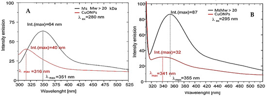 2.2.2. Characterization of CuONPs-Muc Using UV–Vis and Fluorescence Spectroscopy