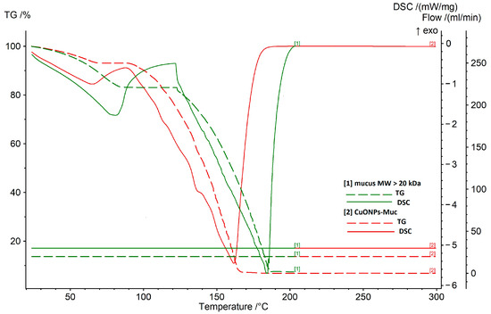 2.3. Characterization of CuONP-Muc Stability Using TG/DSC-MS Analysis