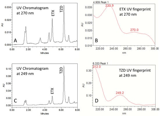 Ultraviolet chromatograms at 270 nm (A) and 249 nm (the wavelength used for the internal standard trazodone HCl quantification) (B), showing the separation of the eluted etoricoxib (ETX) and trazodone HCl (TZD) in plasma, reproduced from one of the pharmacokinetic study samples; ultraviolet fingerprints of ETX at 270 nm (C) and of TZD at 249 nm (D).