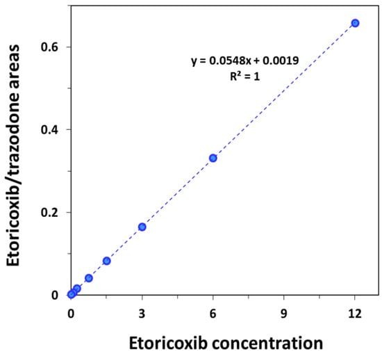 Selectivity was determined by analysis of spiked plasma samples from six different rats, in which no interference was seen in the retention times of the analyte and IS. The matrix effect showed the low interference of 11% from the sample matrix. That is, there is no measurable analyte in the matrix and the matrix effect is low; therefore, there is no effect on the results of the bioanalysis method validation. Stability was confirmed for all studied samples (n = 3) and concentrations (12 and 0.1 µg/mL) after 4 h at room temperature (95.2% and 110%, respectively) and after 24 h at 4 °C (91.1% and 99.2%, respectively). This is in line with the available literature on etoricoxib being stable in plasma under different conditions [10]. Linearity was determined by analyzing a series of calibration standards of blank plasma spiked with eight different concentrations (including 0 µg/mL) of etoricoxib. The curve was constructed with the x-axis as the concentration of etoricoxib and the y-axis as the ratio between the areas of etoricoxib and the IS. The curve at concentrations 0–12 µg/mL was linear (R2 = 1) (Figure 2). Accuracy and precision were studied via the injection of six replicates of three different concentrations of 0.1, 3 and 12 µg/mL. The means (n = 6) of intra- and inter-day accuracy values of three different concentrations were <5% and <1%, respectively, while intra- and inter-day precision were <3% and <5%, respectively (Table 1). The efficiency of extraction recovery from rat plasma-spiked etoricoxib concentrations 3 and 12 µg/mL were 90.0 ± 0.55 and 102.1 ± 0.12%, respectively.