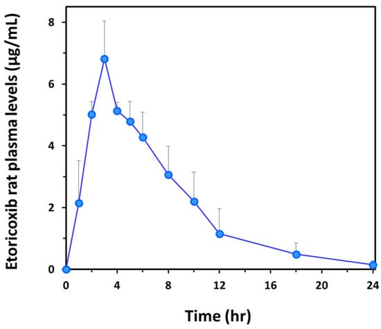 The mean plasma concentration–time curve of etoricoxib in rats (n = 3) after a single intragastric administration of 20 mg/kg of the drug inside a mini-capsule. Bars represent standard deviation.