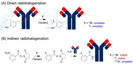 Debromination also occurs in radiobrominated proteins using direct methods [33]. Radiobromine shows nonspecific accumulation in the extracellular space [34], resulting in persistent localization to the blood and organs [33]. Indirect radiobromination is also helpful for reducing the dehalogenation of radiobrominated and radioiodinated compounds (Figure 1B). Since radiobromination requires stronger and larger amounts of oxidants than radioiodination [35], indirect radiobromination is also beneficial for retaining the inherent affinity of the parental antibodies. The reaction conditions for N-succinimidyl 4-bromobenzoate were optimized by Höglund et al. [36].