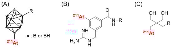 Scaffolds providing 211At-labeled compounds with high in vivo stability. (A) closo-decaborate(2-), (B) 3-[211At]astato-5-guanidinomethyl benzoyl, and (C) neopentyl glycol scaffolds.