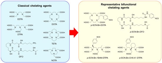 Classical chelating agents, EDTA and DTPA (Figure 3), are versatile and applicable to various radiometals, but they show low or moderate degrees of dissociation [59]. Macrocyclic chelators such as DOTA (Figure 3) show more kinetically inert complexes than those formed by acyclic chelators such as EDTA and DTPA [60], which is known as the macrocyclic effect [61]. Among several bifunctional DOTA derivatives, p-SCN-Bn-DOTA (Figure 3) is the most representative because it is commercially available, easy to handle, and can be conjugated using a well-established protocol [62]. Thus, p-SCN-Bn-DOTA is the most representative BFC for the development of radiopharmaceuticals with various radiometals, such as 111In, 90Y, 177Lu, 225Ac, 212/213Bi, 227Th, and 212Pb [25]. However, DOTA requires elevated conditions for radiolabeling. DOTA is now used as the current gold standard chelator for several radiometals in the radiolabeling of peptides [63,64], but other choices still have been searched for the radiolabeling of proteins. Several DTPA derivatives, such as 1B4M-DTPA and CHX-A’’-DTPA (Figure 3), have been developed to enhance the stability of DTPA complexes with various radiometals [65,66]. They formed sufficiently stable In/Y-complexes; indeed, 1B4M-DTPA was used as the BFC in Zevalin. Other acyclic chelators have also been developed [67,68,69].