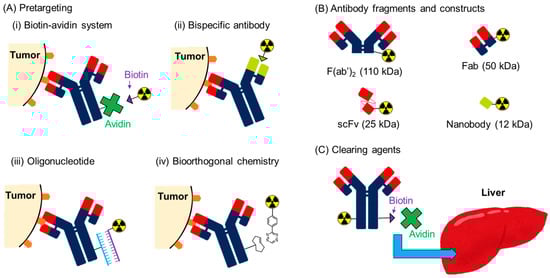 Radiolabeled antibody fragments and constructs show more rapid blood clearance and distribution in tumor tissues than intact IgG antibodies (Figure 4B). In addition, they show an evener distribution than radiolabeled antibodies, which is an advantage that cannot be obtained using pretargeting approaches. However, the advantages of these antibodies are limited owing to their decreased accumulation in tumors [131]. In addition, radiolabeled antibodies exhibit high levels of radioactivity in the kidney, which is the main dose-limiting organs [132]. Renal accumulation also impairs the precise imaging proximal to the kidney, but more critically, it impairs the therapeutic effects of RIT. Both the injection dose and the tumor accumulation after injection are limited by renal accumulation and impaired binding affinity, respectively, resulting in impaired therapeutic effects.