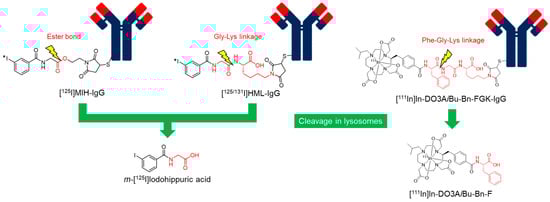 To improve the stability of ester bonds, a peptide linkage cleaved by lysosomal degradation has been proposed [148]. Based on the strategy, 3′-iodohippuryl Nε-maleoyl-L-lysine (HML) was developed (Figure 5), in which the Gly-Lys sequence was inserted between the benzoyl moiety as a radiolabeling part and the maleimide group as a conjugation part with an antibody. HML releases the same radiometabolite, [125I]m-iodohippuric acid, as MIH in liver lysosomes. In contrast to the plasma instability of the ester bond, the Gly-Lys linkage showed significantly improved stability. When incubated in human serum, [125I]MIH-IgG released more than 50% of its initial radioactivity after 24 h, whereas [131I]HML-IgG released less than 1% of its radioactivity during the same interval. In biodistribution studies, [131I]HML-IgG showed similar radioactivity levels in the tumor as [125I]MIH-IgG at 24 h post-injection but was significantly higher at 48 h post-injection. In addition, [131I]HML-IgG showed radioactivity levels in the tumor and blood comparable to those of [111In]In-EDTA-labeled IgG 24 and 48 h post-injection. Simultaneously, [131I]HML-IgG exhibited a significantly higher tumor-to-liver ratio than [111In]In-EDTA-labeled IgG. These results indicate that [131I]HML-IgG can reduce radioactivity levels in the liver without impairing tumor accumulation.