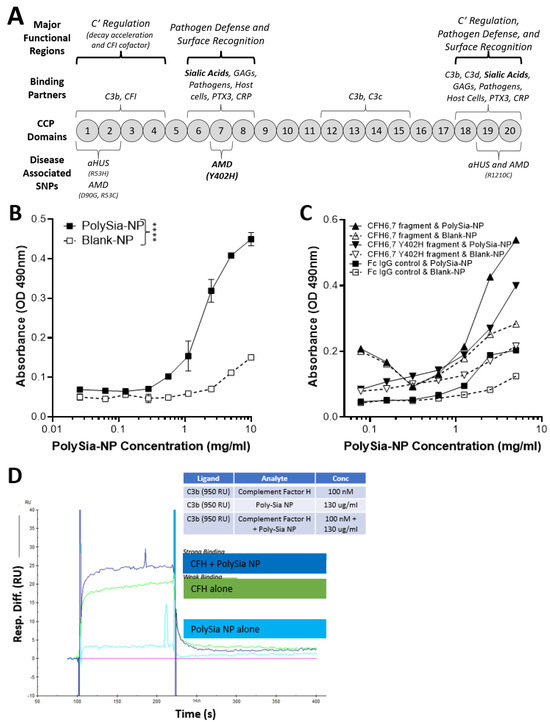 Complement factor H (CFH) and PolySia-NPs. PolySialic acid nanoparticles bind to complement inhibitor CFH and enhance binding of CFH to C3b. (A) Simple diagram of CFH structure with selected binding domains and disease-associated SNPs. CCP domains 6–7 and 19–20 bind sialic acid to regulate complement activation, and CCP domain 7 contains the most common AMD-associated polymorphism (Y402H). (B) PolySia-NP bound directly to CFH (C; IC50 = 2 mg/mL) in an assay in which CFH-His or fragment CFH-IgG was bound to appropriate plates, incubated with PolySia-NP or control NP, labeled with biotinylated PEG antibody, and absorbance quantified (N = 4 independent experiments; **** p < 0.0001 2 way ANOVA treatment main effect). (C) PolySia-NP also bound directly to CFH fragments of CCP domains 6–7, both wild-type and Y402H polymorphism. (D) Biacore binding assay demonstrated increased binding of CFH to C3b in the presence of PolySia-NP (“CFH + PolySia-NP”; dark blue line), versus without PolySia-NP (“CFH alone”; green line) and PolySia-NP alone (light blue line).