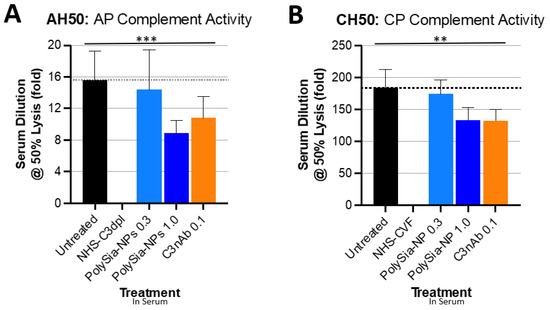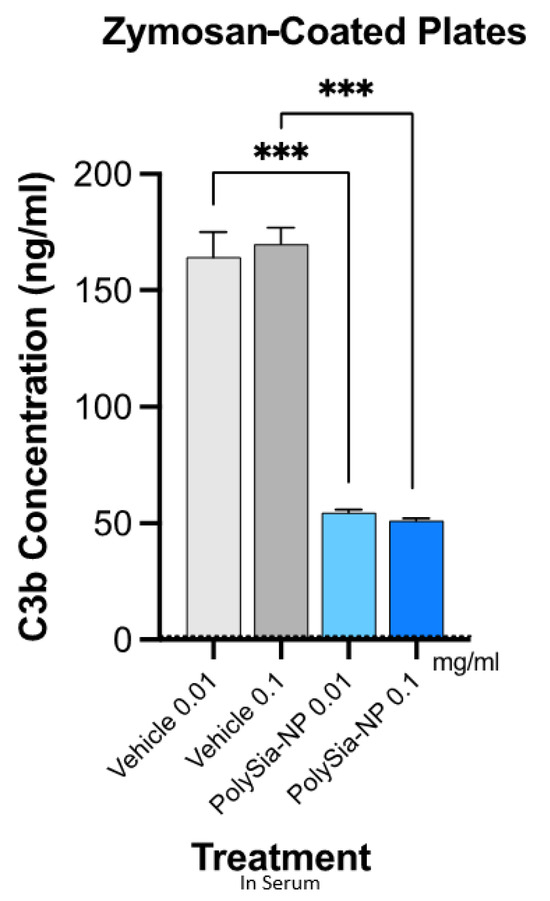 We, therefore, next tested the potential for PolySia-NPs to suppress alternative pathway complement activity in human serum using the serum C3b deposition assay (Figure 4), in which normal human serum was spiked with Zymosan (yeast cell wall preparation; potent AP activator) and either vehicle (10% sucrose control) or PolySia-NP (0.01 mg/mL, 1 mg/mL), and C3b deposition onto the well surface was quantified. As shown in Figure 4, PolySia-NPs substantially and significantly decrease C3b deposition from human serum. PolySia-NP-mediated complement inhibition appears to be equal to or stronger than that of PolySia alone [38].