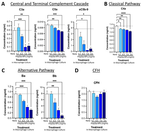 PolySia-NPs affect complement activity in human macrophages. PolySia-NP treatment of cultured human PBMC-derived M1 macrophages decreased complement activation markers (e.g., anaphylatoxins), mainly through inhibition of the alternative pathway, as measured using complement multiplex ELISA. (A) Treatment of macrophages with PolySia-NP decreased C3a and C5a anaphylatoxin and sC5b-9 soluble MAC production of the central and terminal complement cascades, respectively. Treatment of macrophages with PolySia-NP slightly decreased classical pathway C4a anaphylatoxin levels (B) and strongly decreased levels of alternative pathway activation fragments Ba and Bb (C). (D) Treatment of macrophages with PolySia-NP did not substantially affect alternative pathway inhibitor CFH levels. * p < 0.05, ** p < 0.01, *** p < 0.001, **** p < 0.0001 1way ANOVA Dunnett’s post-test PolySia-NP vs. untreated control (“None”).