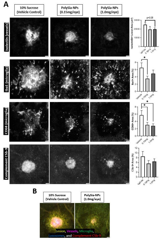 To confirm these findings in vivo, we utilized a humanized Siglec-11 transgenic mouse model in a laser-induced choroidal neovascularization (laser CNV) model of wet AMD (Figure 7). In this disease model, laser-injury of the choroid induces inflammation, neovascularization, and visual deficits. Mice were treated with PolySia-NP (low or high dose) or vehicle control (10% sucrose) at the time of laser CNV induction and euthanized 8 days later; immunohistochemical analysis of blood vessels (Isolectin-B4), pro-inflammatory monocytes (Iba-1 and CD68), and complement (C5b-9) markers was performed on the laser injury sites in choroidal tissue.