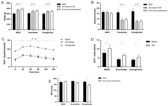 (A) Effects of GLP-1RA on weight, (B) effect of GLP-RA on glycemia levels, (C) effect of GLP-1RA on glucose level during OGTT, (D) effect of GLP-1RA on insulin level during OGTT, (E) effect of GLP-1RA on systolic blood pressure. Values are presented as mean ± SD. Statistical significance at the level * p < 0.05, ** p < 0.01. MetS: metabolic syndrome group. Exenatide: group of rats treated with exenatide. Dulaglutide; group of rats treated with dulaglutide. BDA: before drug administration. 3rd week of DA: third week of drug administration. Before: before OGTT (glucose administration) a, #—MetS vs. Exenatide; b, &—MetS vs. Dulaglutide.