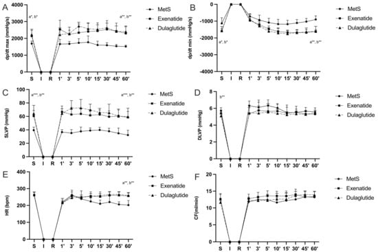 Effect of GLP-1RAs on cardiodynamic parameters: (A) dp/dt max—the maximum rate of LV pressure development, (B) dp/dt min—minimum rate of LV pressure development, (C) SLVP—systolic LV pressure, (D) DLVP—diastolic LV pressure, (E) HR—heart rate, and (F) CF—coronary flow. Values are presented as mean ± SD. Statistical significance at the level * p < 0.05, ** p < 0.01, *** p < 0.001. MetS: metabolic syndrome group; exenatide: group of rats treated with exenatide; dulaglutide; group of rats treated with dulaglutide. a—MetS vs. Exenatide; b—MetS vs. Dulaglutide. S—stabilization, I—ischemia, R—reperfusion.