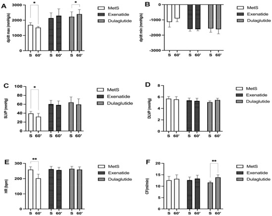 Effect of GLP-1RAs on cardiodynamic parameters: (A) dp/dt max—the maximum rate of LV pressure development, (B) dp/dt min—minimum rate of LV pressure development, (C) SLVP—systolic LV pressure, (D) DLVP—diastolic LV pressure, (E) HR—heart rate, and (F) CF—coronary flow. Values are presented as mean ± SD, statistical significance at the level * p < 0.05, ** p < 0.01. MetS: metabolic syndrome group; exenatide: group of rats treated with exenatide; dulaglutide: group of rats treated with dulaglutide; S—stabilization period; 60′—60 (last) minute of reperfusion.