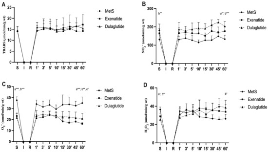 Values of index of lipid peroxidation measured as TBARS did not change significantly among all three groups (TBARS values (µmol/mL) at the end of stabilization and in the last minute of reperfusion, respectively—MetS—14.18, 17.23; Exenatide—14.09, 14.21; Dulaglutide—14.34, 15.45) (Figure 4A and Figure 5A). The level of nitrites (NO2−) was considerably increased in both investigated GLP-1RAs, exenatide, and dulaglutide in the last minute of the reperfusion period and in the dulaglutide group at the stabilization point compared to MetS (NO2− values (nmol/mL) at the end of stabilization and in the last minute of reperfusion, respectively—MetS—131.36, 132.89; Exenatide—164.3, 175.85; Dulaglutide—183.93, 203.76) (Figure 4B). In coronary venous, effluent super oxide anion radical (O2−) was significantly decreased at the end of the stabilization period and then compared the exenatide and dulaglutide group to MetS, while at the end of reperfusion, O2− values had significantly changed between all three groups as follows Exenatide > Dulaglutide > MetS (O2− values (nmol/mL) at the end of stabilization and in the last minute of reperfusion, respectively—MetS—37.63, 35.09; Exenatide—26.44, 15.55; Dulaglutide—21.89, 21.01) (Figure 4C). When comparing values at the end of stabilization and at the end of reperfusion noticeable changes are in the group treated with exenatide (Figure 5C). Values of H2O2 were lower in both of the treated groups at the end of the stabilization period but increased during reperfusion with statistical significance in the dulaglutide group at 60 min of reperfusion compared to MetS (H2O2 values (nmol/mL) at the end of stabilization and in the last minute of reperfusion, respectively—MetS—36.41, 26.27; Exenatide—28.9, 33.86; Dulaglutide—25.51, 38.61) (Figure 4D). Changes between the stabilization point and the last minute of reperfusion were observed in the MetS group where we had markedly lower values of hydrogen peroxide, and the opposite was observed in the dulaglutide group where we had higher values (Figure 5D).