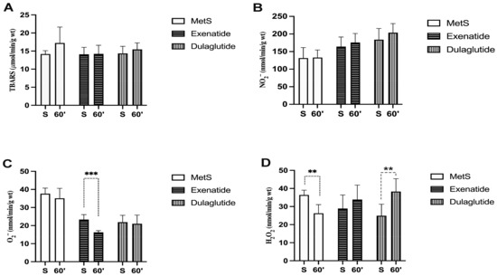 Effect of GLP-1RAs on pro-oxidants in coronary venous effluent: (A) TBARS—index of lipid peroxidation, (B) NO2−—nitrite, (C) O2−—superoxide anion radical and, (D) H2O2—hydrogen peroxide. Values are presented as mean ± SD, statistical significance at the level ** p < 0.01, *** p < 0.001. MetS: metabolic syndrome group; exenatide: group of rats treated with exenatide; dulaglutide: group of rats treated with dulaglutide; S—stabilization period; 60′—60 (last) minute of reperfusion.