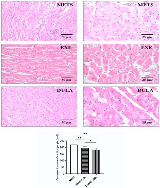 Representative micrograph of H&E staining of the cardiac muscle. Left row (objective magnification 20×, bar = 50 μm). Right row (objective magnification 40×, bar = 25 μm). METS: metabolic syndrome group; EXE: group of rats treated with exenatide; DULA: group of rats treated with dulaglutide. Graph represents values of the cross-section area of the cardiomyocyte of all groups. All values are the mean value ± SD. Statistical significance at the level * p < 0.05, ** p < 0.01 vs. the adequate group, connected by a horizontal line.