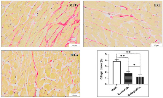 Representative micrographs of Picrosirius red-stained rat cardiac muscle sections (objective magnification 40×, bar = 20 μm; collagen fibers). METS: metabolic syndrome group; EXE: group of rats treated with exenatide; DULA: group of rats treated with dulaglutide. Graph represent quantification of collagen content (%) for all groups. All values are the mean value ± SD, statistical significance at the level * p < 0.05, ** p < 0.01 vs. the adequate group, connected by a horizontal line.