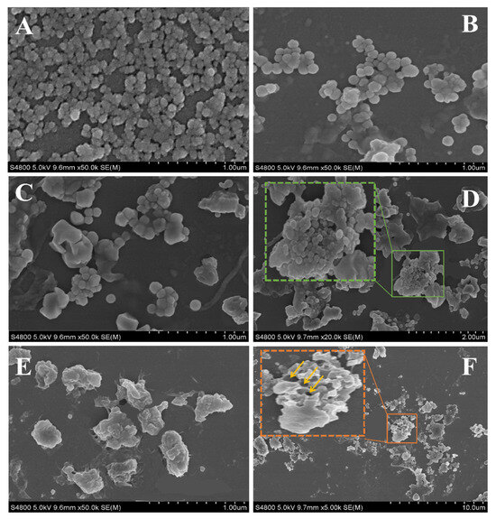 SEM images of nanoparticles. (A): SPI nanoparticles; (B): SPI nanoparticles loaded curcumin; (C,D): Car/SPI/C nanoparticles at different magnifications; (E,F): Fuc/Car/SPI/C nanoparticles at different magnifications. The green box and orange show the uncoated region and cross-section of nanoparticles, respectively; The yellow arrow points to core holes in nanoparticles.
