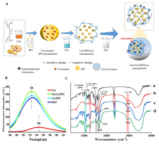 Therefore, the purpose of this study was to better stabilize curcumin-loaded SPI nanoparticles and achieved an improved controlled release and enhanced antioxidant properties via a dual-anionic polysaccharide coating. This innovative approach to stabilizing curcumin-loaded SPI nanoparticles with a Fuc/Car-reinforced 3D coating network without a crosslinker would be an effective method with good prospects for functional food or drug applications. The results that prove our concept are presented in the following section.