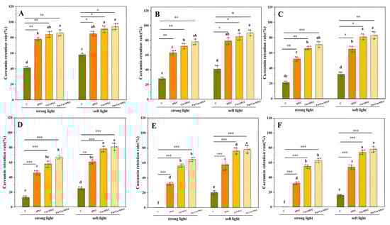 The photochemical stability of the samples. (A): after 8 h of strong light and 16 h of soft light; (B): after 16 h of strong light and 32 h of soft light; (C): after 24 h of strong light and 48 h of soft light; (D): after 32 h of strong light and 64 h of soft light (E): after 40 h of strong light and 80 h of soft light (F): after 48 h of strong light and 96 h of soft light. * indicates a significant difference between groups: * p < 0.05, ** p < 0.01, *** p < 0.001. C represents pure curcumin.