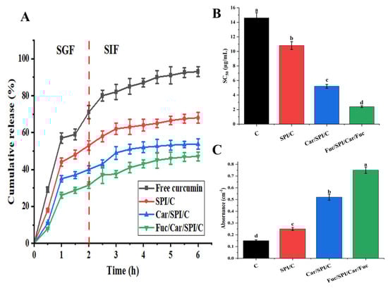 A DPPH radical scavenging test and reducing power assay were employed to determine the in vitro antioxidant activity of different samples, as shown in Figure 6B,C. The results revealed a higher antioxidant activity for Fuc/Car/SPI/C compared to pure curcumin and other nanoparticles, which is reflected in the significant decrease in SC50 (p < 0.05) and remarkable increase (p < 0.05) in the reducing power. This can be justified by the enhanced supramolecular interactions (including ion–dipole, hydrophobic interaction, and electrostatic interactions) between Fuc and Car-stabilized SPI nanoparticles due to sulfates and the other polar groups provided by Fuc. In accordance, Wang et al. [32] also reported that Fuc and Car form a strong entanglement network compared to non-gelling Fuc, and this is speculated to be the main reason for the improvement in antioxidant activity.