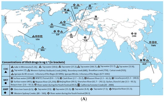 Figure 1A illustrates the widespread presence of COC, METH, and AMP in surface and tap water across continents. COC concentrations are variable, from European tap water samples (e.g., 18.6 ng/L in France to 166.7 ng/L in Portugal) to discharge points of wastewater treatment plants in Australia (e.g., 2990 ng/L at Redbank Creek) [65,66]. High MET concentrations are observed globally, with notable levels in the rivers of Taiwan and the USA (up to 25,250 ng/L in Hawkesbury-Nepean River) [66,67,68]. AMP is less frequently detected but still present, with traces found in European tap water and surface water in China and Taiwan [65,67,69].