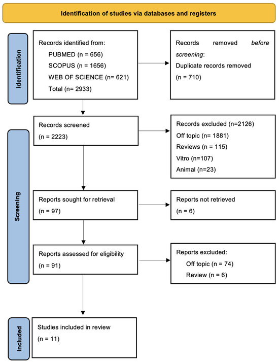 Following the removal of duplicates (n = 710), the titles and abstracts of 2223 studies were assessed in order to filter them. An amount of 97 records were chosen out of 2126 papers that did not match the inclusion criteria (1881 off-topic, 115 reviews, 107 vitro experiments, 23 animal research). Six records that could not be retrieved were subsequently eliminated, and ninety-one reports that did not fit the inclusion requirements were eliminated as well (seventy-four off-topic, six reviews). Eleven records were chosen for a qualitative analysis after being deemed eligible. Figure 2 and Table 2, respectively, present the selection procedure and the summary of the records that were chosen.