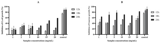 The antibacterial activity of G–CH–M biopolymer at different concentrations against (A): E. coli and (B): S. aureus using the liquid medium microdilution method. Error bars represent standard deviation of triplicates.