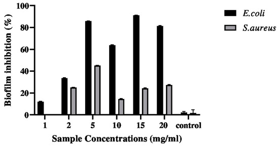 Effects of G–CH–M biopolymer on biofilm formation of S. aureus and E. coli after 24 h of incubation. Error bars represent standard deviation of triplicates.